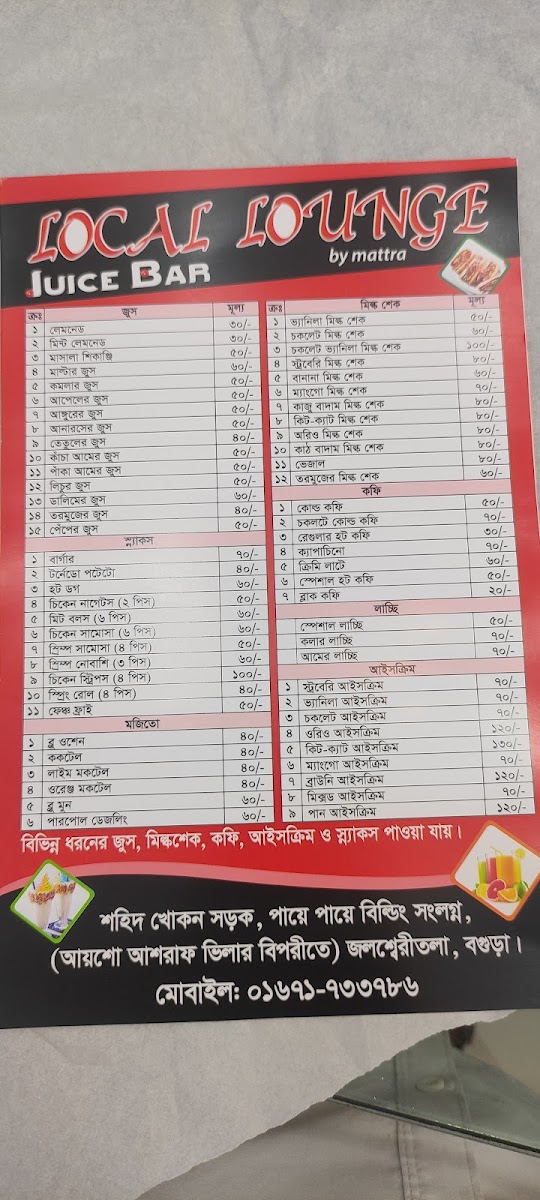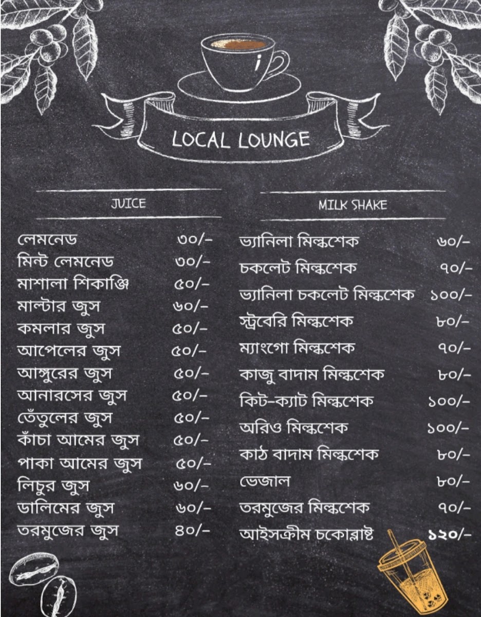 Welcome to Local Lounge, a charming cafe nestled in the heart of Bogura, Bangladesh. This delightful spot is not just about ambiance; it serves up a menu that is both refreshing and indulgent. Customers rave about the mouthwatering juices and delectable cakes, making it an ideal destination for a sweet escape. You can savor a variety of fresh fruit juices, exquisite milkshakes, and invigorating cold coffees, all crafted with passion by the dedicated team led by Nur Mohammad Shaon.